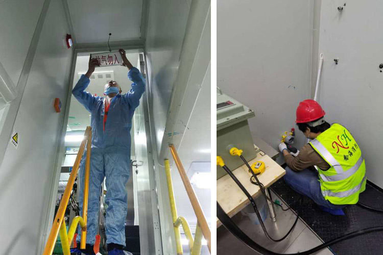 系統安裝完畢,以及相聯動的火災自動報警系統和開口自動關閉裝置、通風機械和防火閥等聯動設備的調試完成后進行海灣氣體滅火系統的調試。